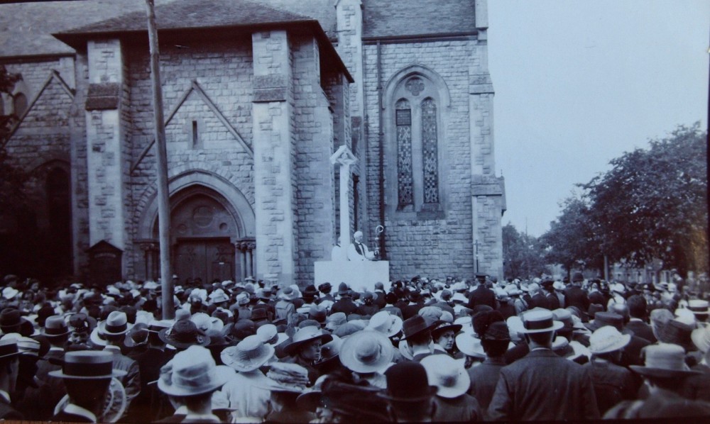 Outside the main door of the church stands a stone pulpit, with a wooden crucifix, which is a memorial to those who died in World War One. This memorial was dedicated in 1919, before a crowd of some 3,000 people, ‘with the Wagon Works Silver Band in attendance’. The names are now faded, but are also listed as part of a memorial to both world wars, that is inside the church and reproduced on this site, along with 2018 research from Royse Murphy.
